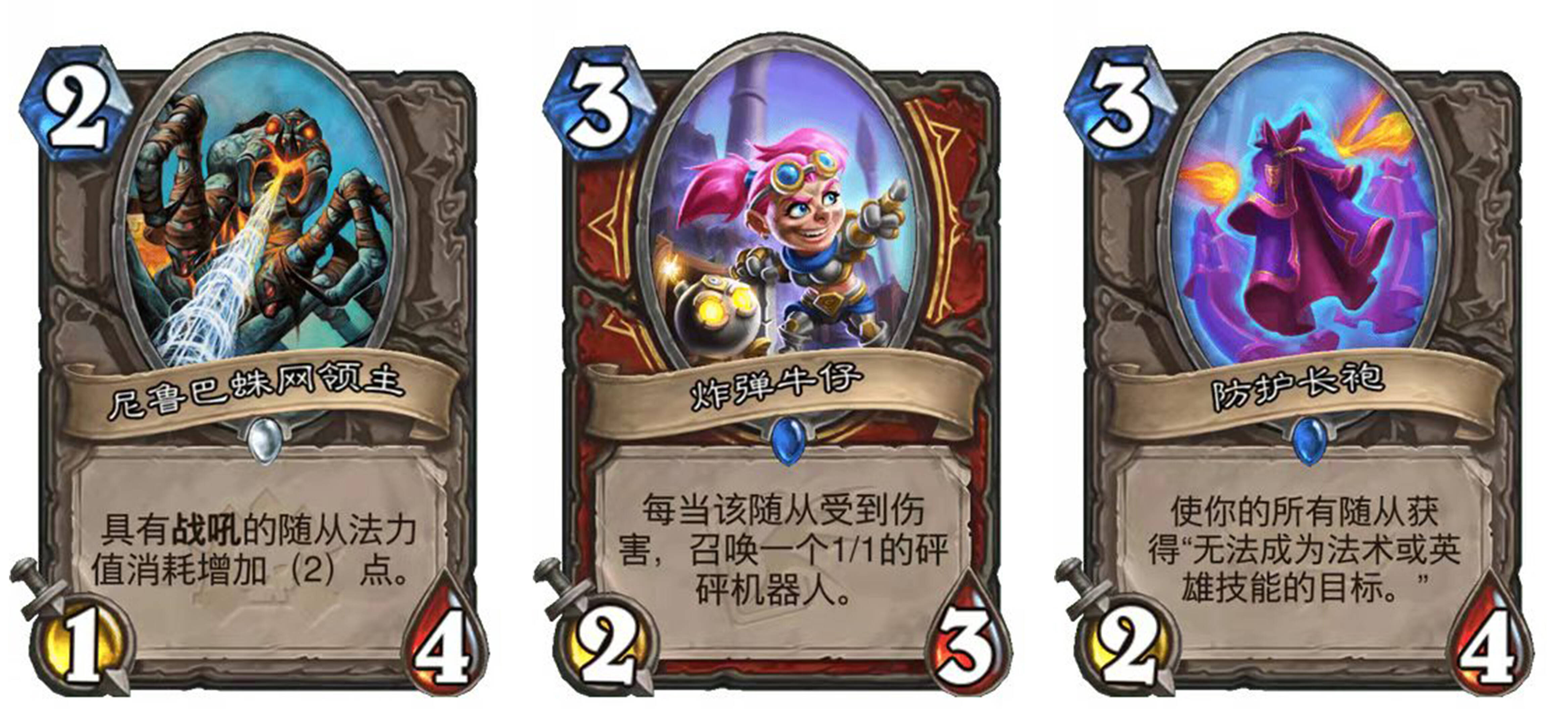·尼鲁巴蛛网领主:本卡组24张随从中只携带了5张战吼随从,与激怒战相性极佳,且针对宇宙、战吼为主的卡组(没错,说的就是40宇暗牧和战吼萨)效果较好,本身214的大屁股身材极易被武器buff起来从而不易被解掉。