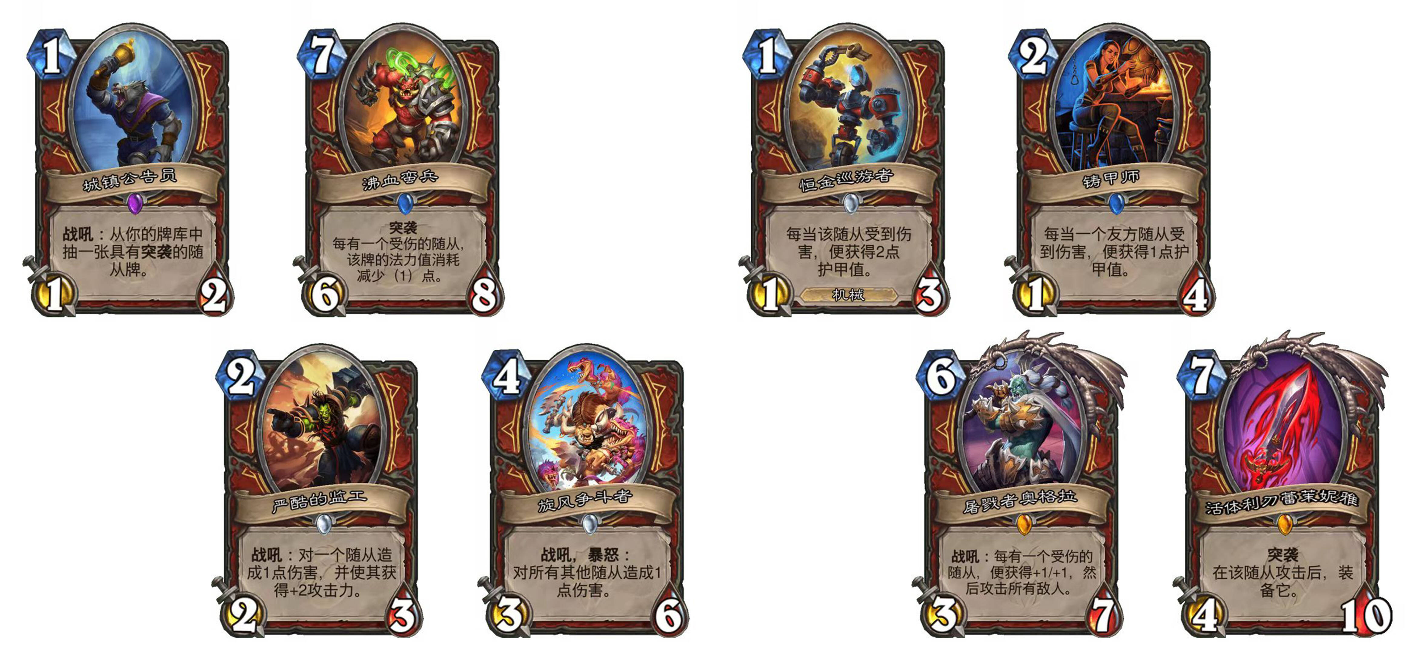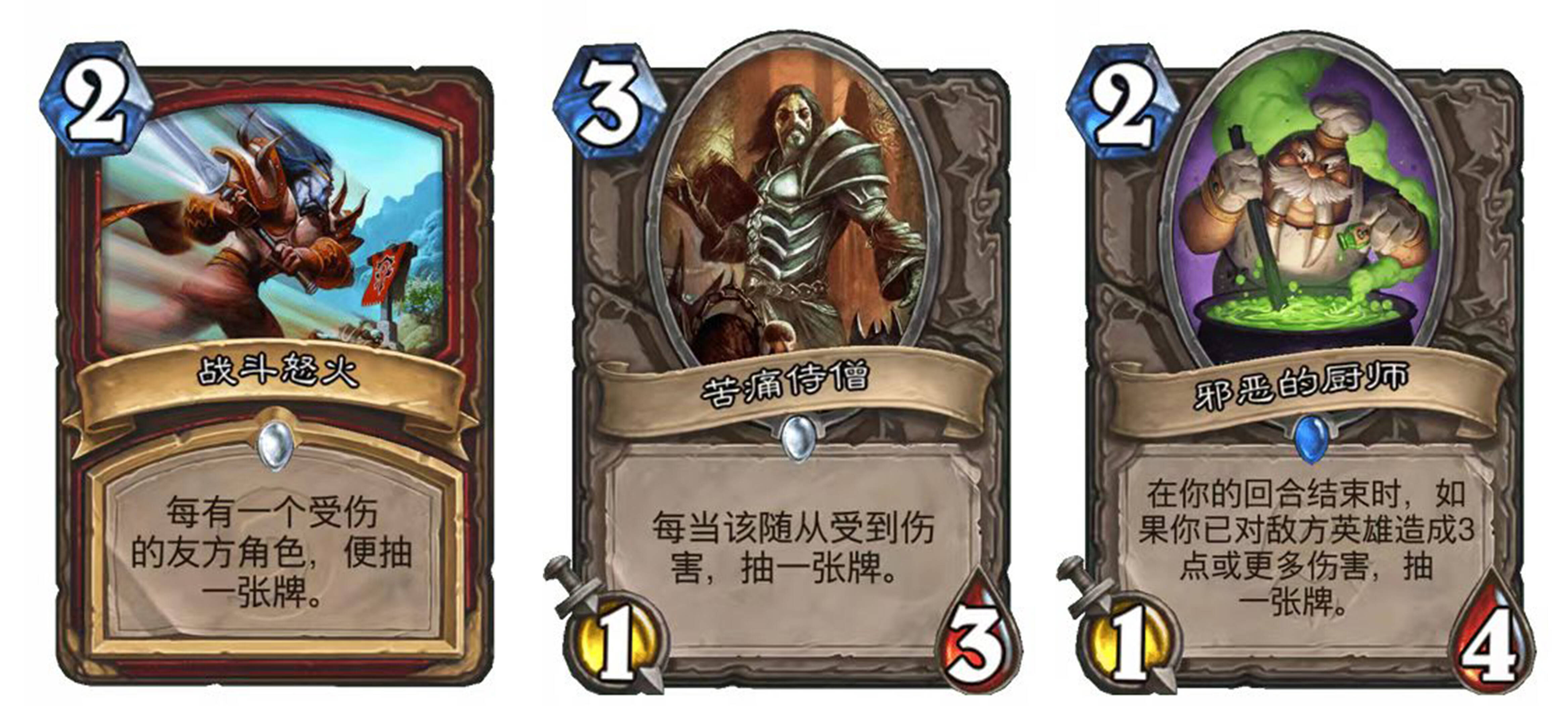 ·战斗怒火:激怒战过牌的保证,2费能过3张就不亏,面对中慢速卡组,尽量英雄掉血才开始叠甲,有心能提取者在场要考虑好是集中buff少数随从,还是过牌后分散buff多数随从。