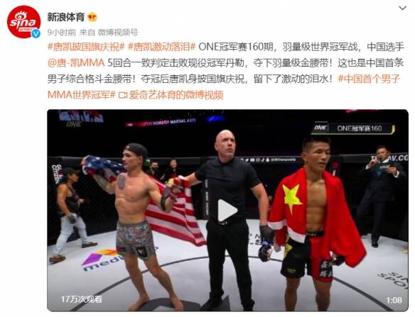 夺冠后唐凯身披国旗庆祝,流下了激动的泪水。26岁的唐凯成为中国首个男子MMA世界冠军。