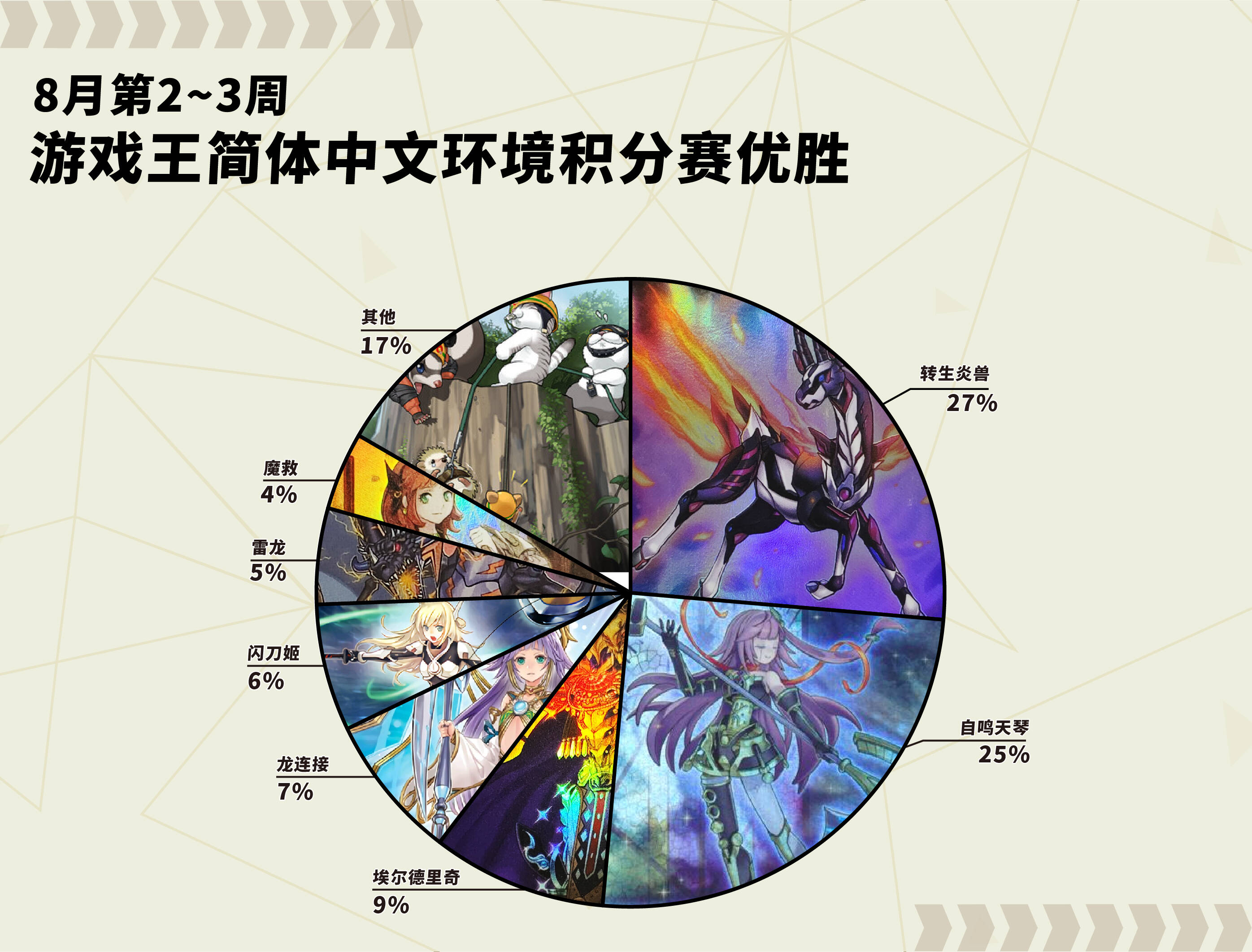 8月第3-4周,我们收集到124场各店铺举办的简中环境积分赛事,计1426人参赛,共收集到124套冠军卡组,这些卡组的类型分布如下: