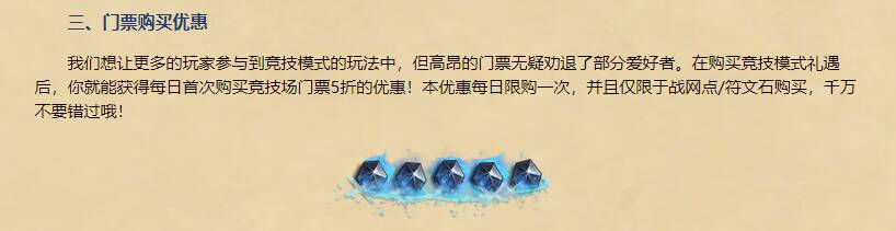 我们想让更多的玩家参与到竞技模式的玩法中,但高昂的门票无疑劝退了部分爱好者。在购买竞技模式礼遇后,你就能获得每日首次购买竞技场门票5折的优惠!本优惠每日限购一次,并且仅限于战网点/符文石购买,千万不要错过哦!