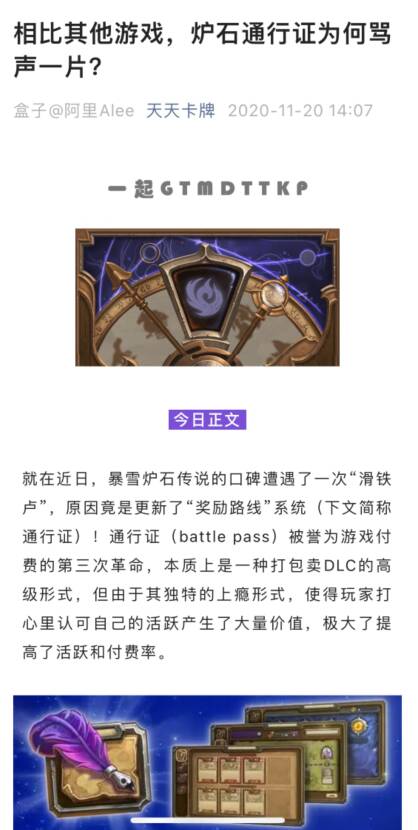 其实之前炉石出通行证那会儿,我也出过一篇文章,这说到底就是一句话,损害了玩家的既得利益——“我原本做每日任务好好的,你给我换成通行证了”。玩家没那么多虚头巴脑的,不会给你算总价值的,就算这个通行证出来,每个版本总投放增加了,还有一堆免费饰品,但就因为礼遇不能金币购买这个点,就足够喷死你了。