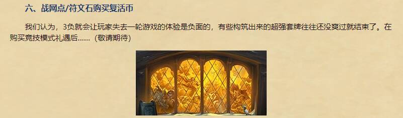 我们认为,3负就会让玩家失去一轮游戏的体验是负面的,有些构筑出来的超强套牌往往还没爽过就结束了。在购买竞技模式礼遇后……(敬请期待)