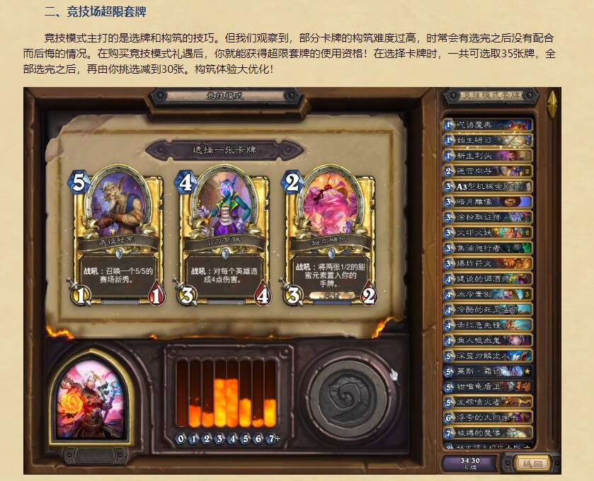 竞技模式主打的是选牌和构筑的技巧。但我们观察到,部分卡牌的构筑难度过高,时常会有选完之后没有配合而后悔的情况。在购买竞技模式礼遇后,你就能获得超限套牌的使用资格!在选择卡牌时,一共可选取35张牌,全部选完之后,再由你挑选减到30张。构筑体验大优化!