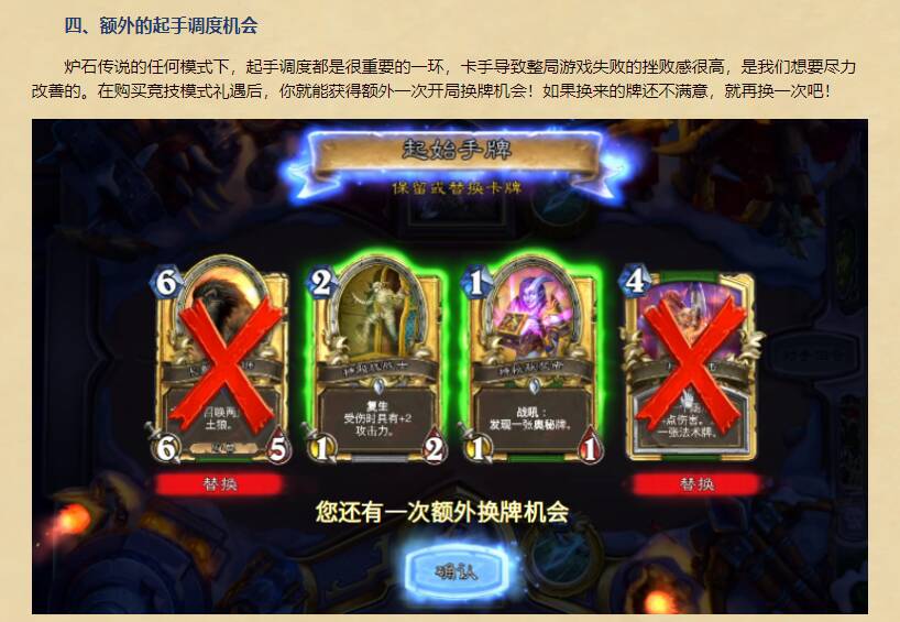 炉石传说的任何模式下,起手调度都是很重要的一环,卡手导致整局游戏失败的挫败感很高,是我们想要尽力改善的。在购买竞技模式礼遇后,你就能获得额外一次开局换牌机会!如果换来的牌还不满意,就再换一次吧!