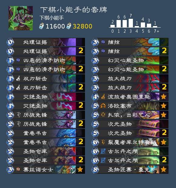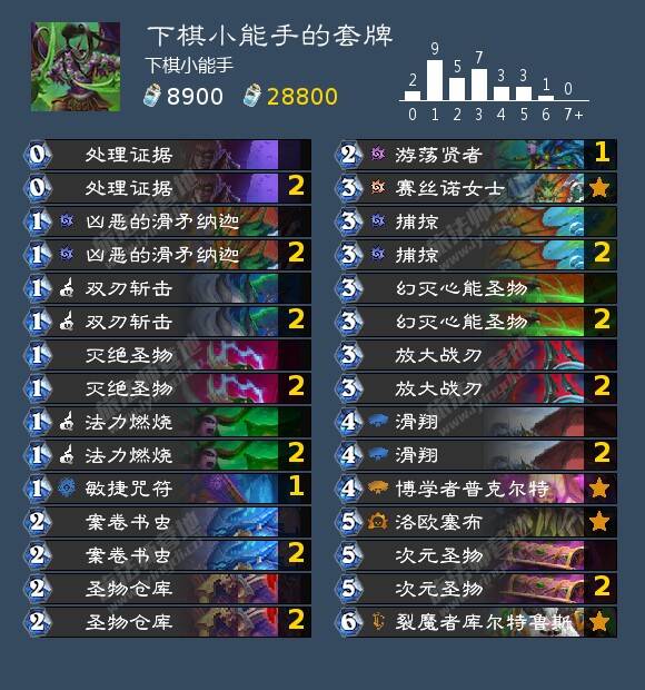 这个构筑就已经具有一定强度了,我通过这个构筑打回了两千并对卡组做出了进一步的优化,将历战先锋替换为了游荡贤者(奥术之尘-400)优化过后很快用这个构筑打进了前一千,然后我开始尝试各种单卡的替换,最终一度掉到一万二得出了这个形态圣物瞎的最优构筑,即将一张游荡贤者替换为敏捷咒符进一步润滑卡组。最终凭借这个卡组我一路打进了五百。然后玩别的又飞到了两千测试了一个与这套思路差别较大的形态