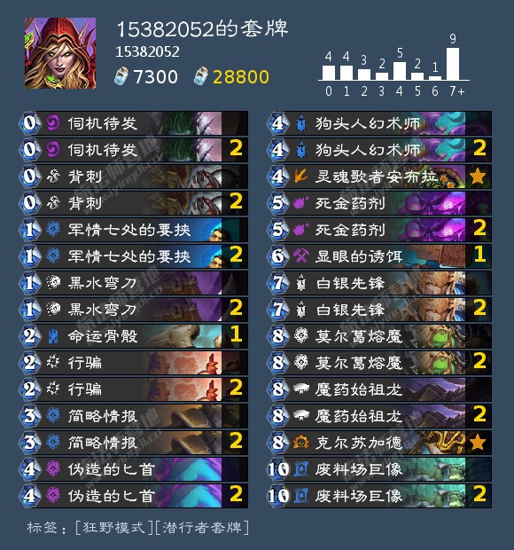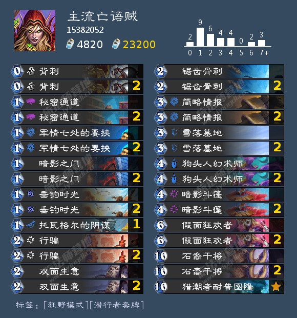 而刚更新前两天,小鬼术偶数萨迅速起势,还有一些仍然在拿海盗贼上分的前朝分奴,癫狂公爵的加入让鬼灵和战吼萨这类及其强调核心卡的卡组受到重创,天梯逐渐开始向场面卡组倾斜。这个环境下,亡语贼在钻石上分区的优势可谓巨大,一旦启动就难以抵挡的场面,控制卡组留牌的信息差,以及不清楚卡组奥妙的众多划水式玩家,让亡语贼成为了玩家口中的4费满场88,4费50场攻的逆天卡组。