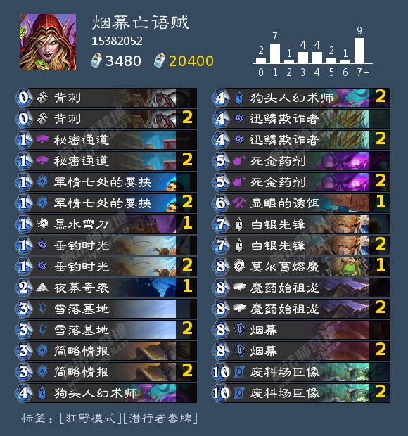到了奥山时代,雪落墓地横空出世,双倍速下的亡语展开变得迅猛而难以抵挡,只要拉出足够多的1077或者88,海盗战暗牧之类的快攻根本无从应对,所以当时这套卡组被成为笨比大哥卡组。奥妮克希亚巢穴和纳迦版本接连推出的迅鳞欺诈者和烟幕的组合让卡组有了另一种启动的可能,并且无需再手动破出亡语,两卡瞬间就能造出一个巨大无比的场面,这个组合现在仍然活跃于标准模式。而对于简略狗头人体系,卡组特性决定了它不能够携带太多白板随从,但烟幕足够高的上限使得大家仍然在构筑中带上这两张组件。但我在纳迦时期沉迷于机克贼,没怎么多打这套亡语贼,所以只能放一个偏脑测的构筑。