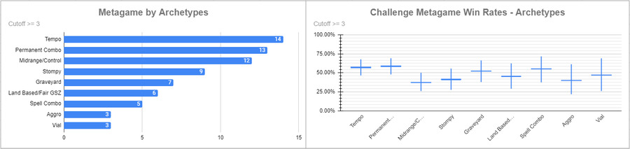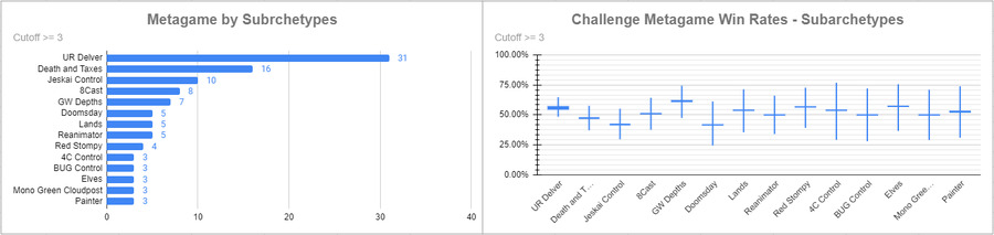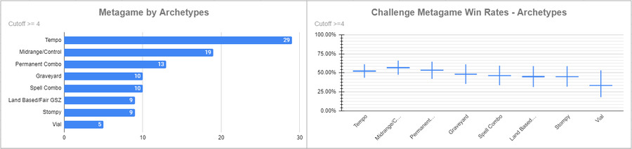 同一周末除了 NRG 外,MTGO 的联赛也将进入尾声, Legacy Showcase Challenge 7/31,共有 281 人参赛。感谢 Legacy Data Collection Project 的数据。