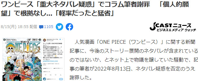 •7月30日时,熊本日日新闻上刊载报道,称“《海贼王》正篇中,大和会加入路飞的伙伴阵营,希望家乡(尾田故乡熊本)铜像再增添一座。”,引发轩然大波,一度导致粉丝们猜测草帽团的最后一位成员就是大和,大和是凯多的女儿,人气相当高。