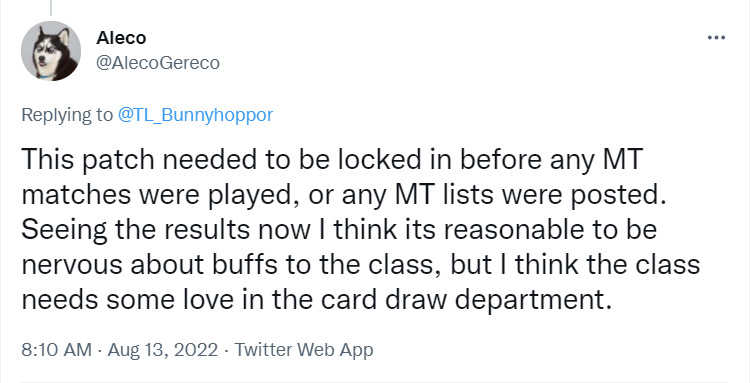 Aleco:感谢反馈。我能理解你是多么想要更大、更系统性的狂野平衡补丁来解决体验糟糕的combo。我同意那样的平衡是会让狂野社区高兴的,但那样的补丁一来可能不应该出自我手(@Matt London),二来现在的平衡补丁主要致力于标准,那样的狂野改动恐怕需要另上。像狗头人幻术师这种小改动现在之所以能捎带上,因为带上它确实工作量不大,属于不跳也能摘的苹果,这种小改动以后是可以常有的,但大规模的有困难。