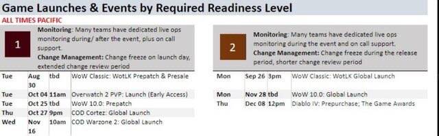 此外图中还有一些其它信息,比如《守望先锋2》PVP 10月4日上线、《使命召唤:现代战争2》10月27日发售、《魔兽世界》巫妖王之怒9月26日推出、《魔兽世界》10.0 11月28日发布。(注:均为太平洋时间,国内晚一天)