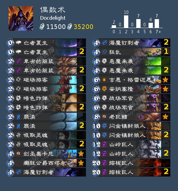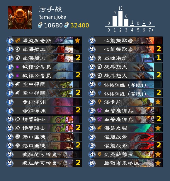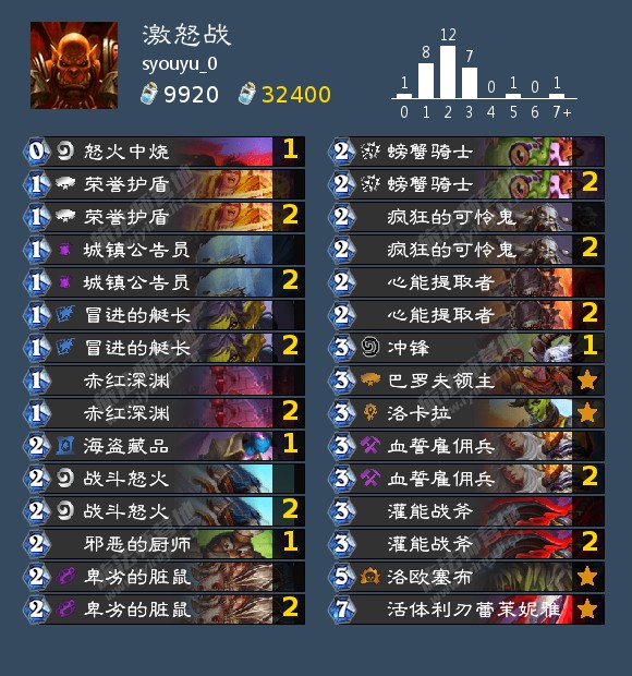 syouyu_0上至25名的激怒战。这套激怒战两套核心,活体利刃蕾茉妮雅+冲锋以及buff疯狂的可怜鬼+复制,思路仍然是快速过牌寻求组件。