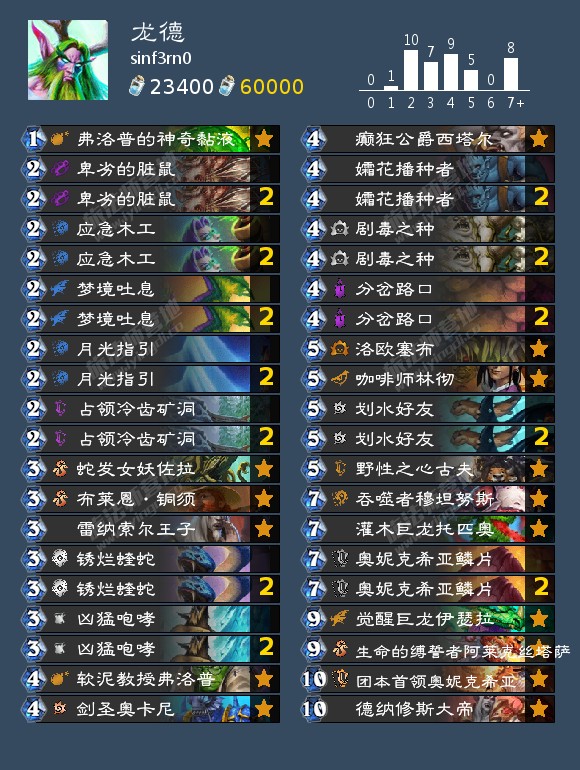 三套龙德,但思路略有不同。德鲁伊在补丁后放弃超凡之盟似乎已经是大势所趋。第一套龙德Pemmin打入了前十,第二套sinf3rn0打到了93,第三套龙德Goku打了12连胜。国服玩家白白丨可爱猪小猪也使用过第三套卡组修改几张的版本在天梯上分。