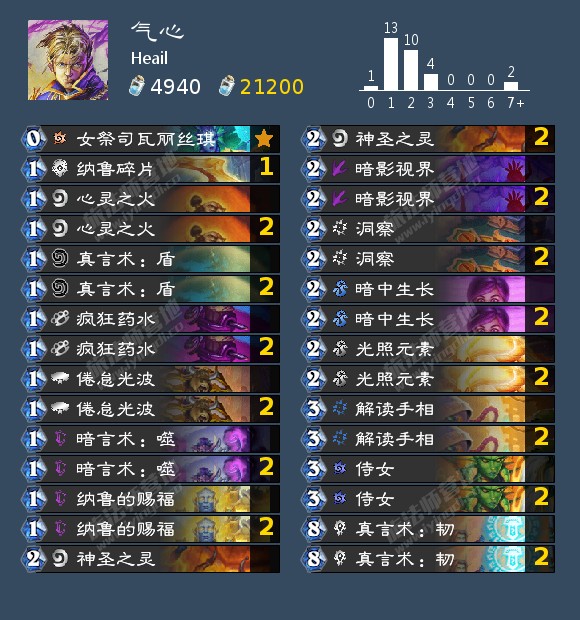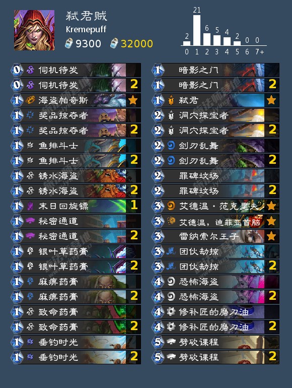 Kremepuff构筑的一套弑君贼,他用这套卡组上升了700名,仍然在继续上分,回调了银叶草药膏也是对弑君小小的加强,可以带上国服特色学术剽窃来弥补牌库厚度不足。