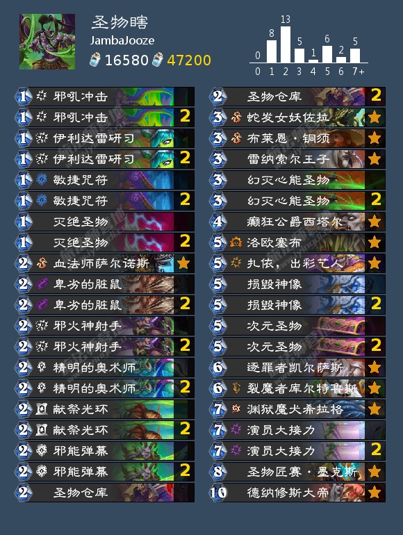 JambaJooze在天梯摆烂的圣物瞎,在前百门口打了13-12(居然有一个胜场),他说最难打的是法师,别的好像都能打打。战绩里有一个五连败,遇到了四个法师。