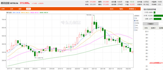 目前,腾讯最新股价315.2港元,相较去年2月749.54港元的最高股价,跌幅接近58%,今年以来也下跌了约30%。