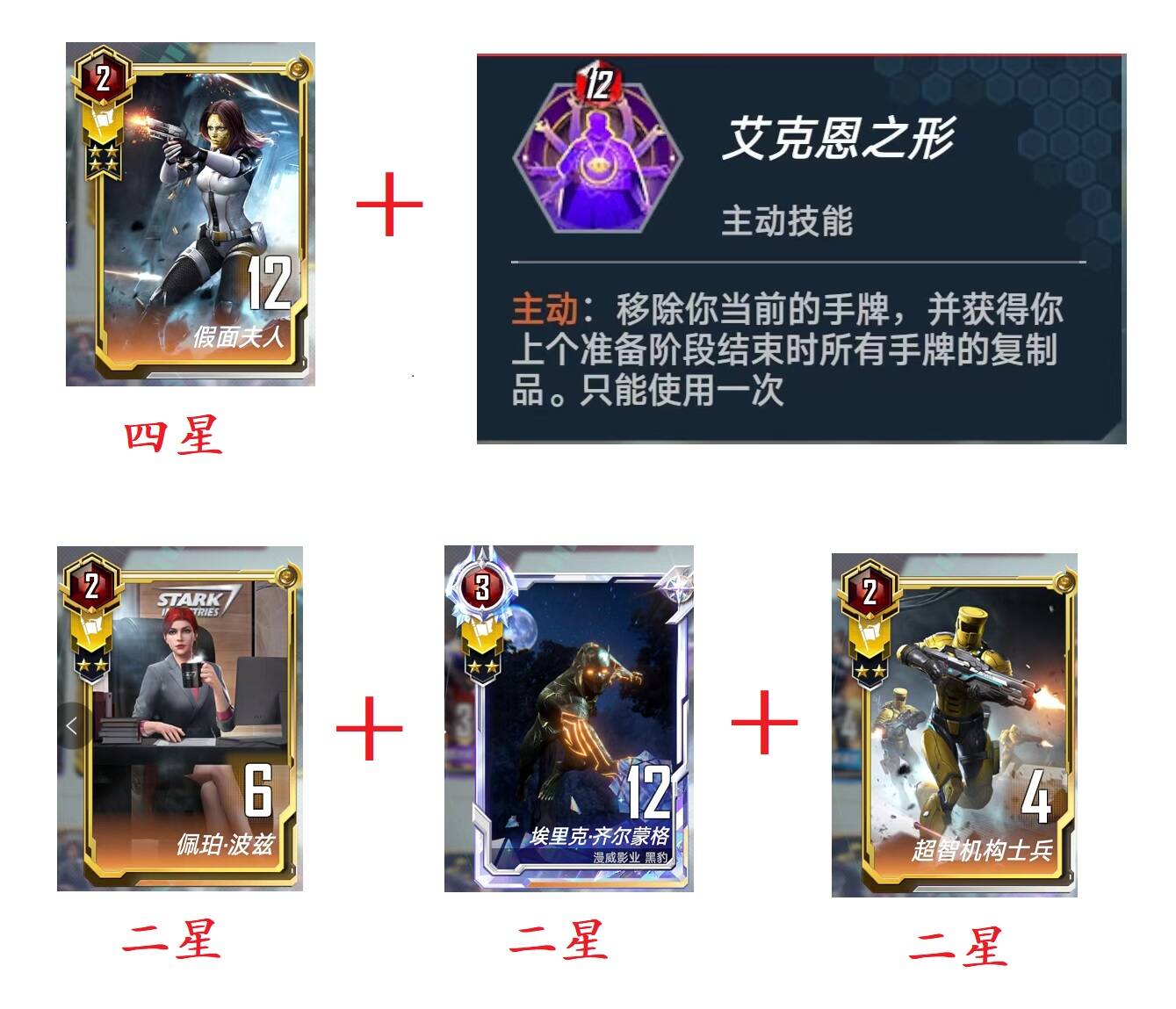 不同于【血赚法师】,因为【夺命博士】卡组的金钱豹和小辣椒中后期都要卖掉,所以包括小黄人都是只带两张,但是假面夫人一定要带四张,假面夫人配合艾克恩之形技能可以有两个四星假面,血加的直接飞起。