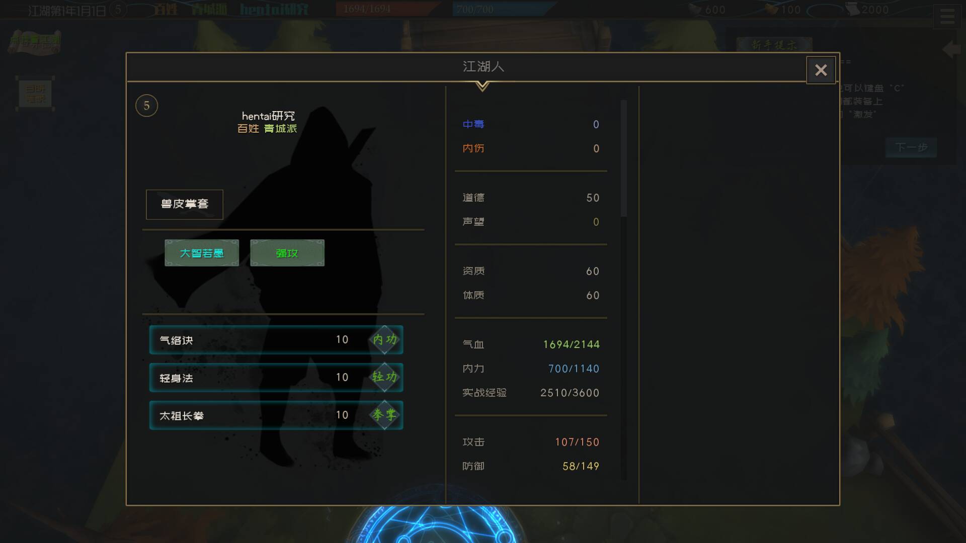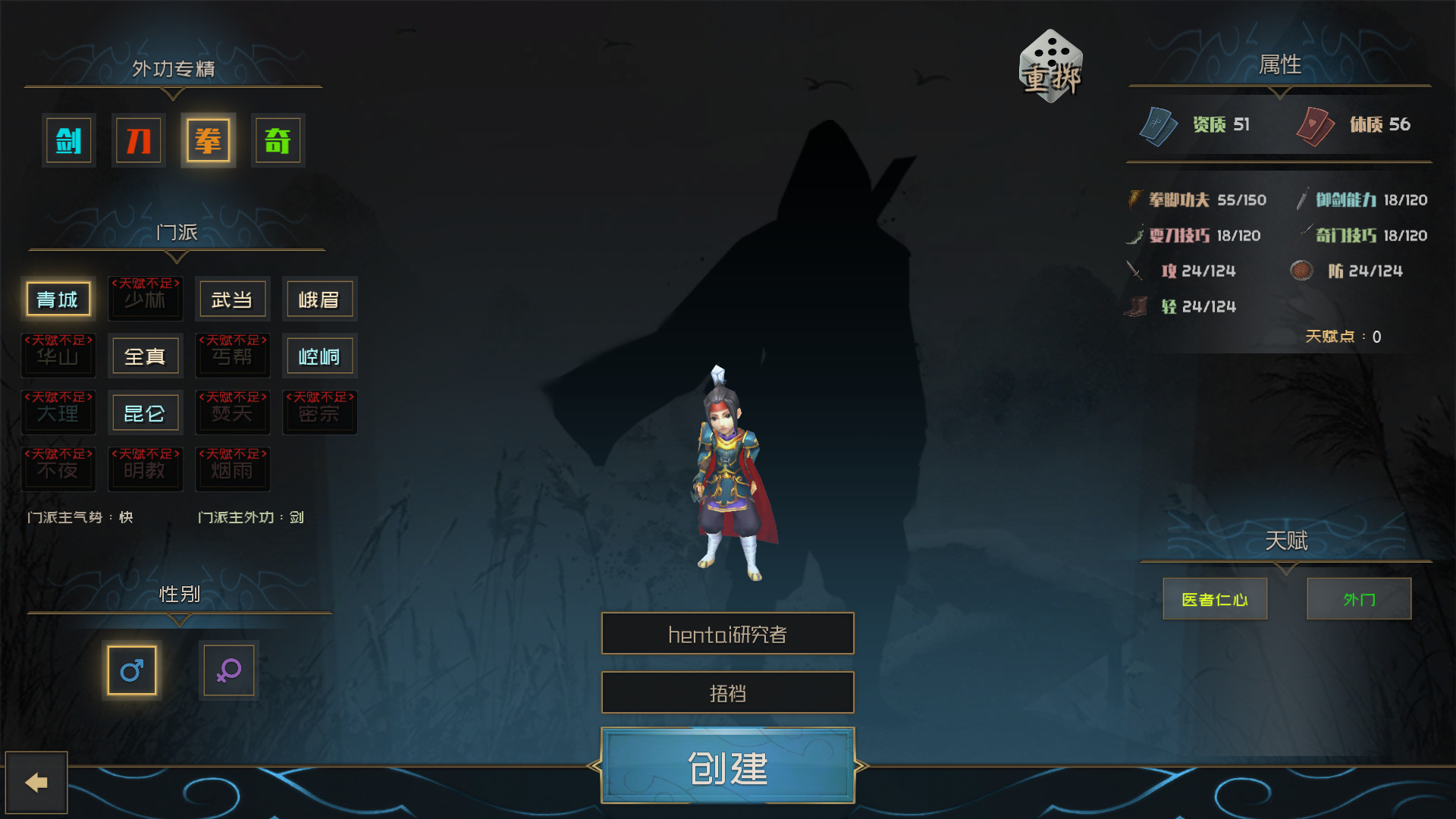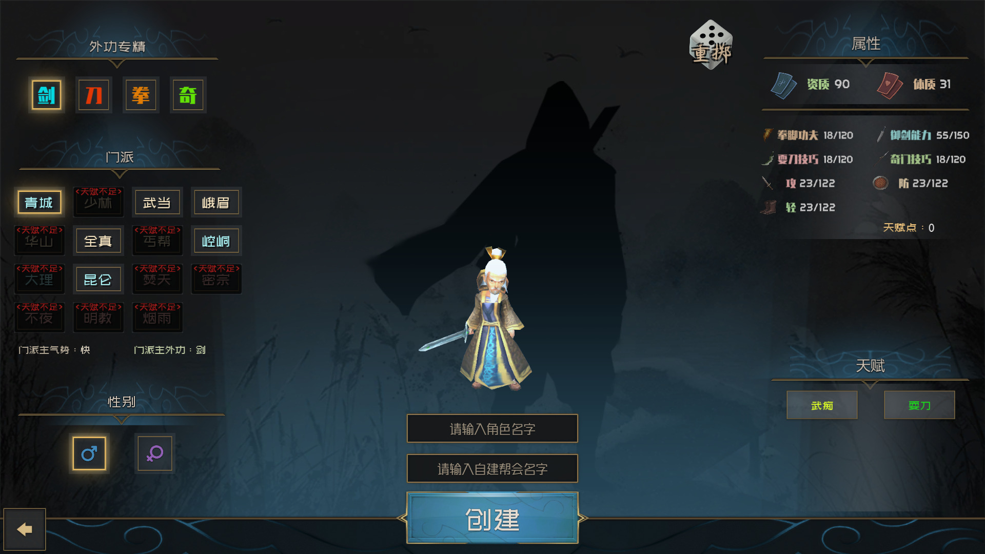 既然建模都这样了,我也没必要精挑细选了,初始天赋点不够,我就随便选了个武功门派,roll了一个金色天赋就开始了。这游戏的主要数值为攻击,防御和轻功,但是每个后面还跟着潜力两字,让我没明白啥意思