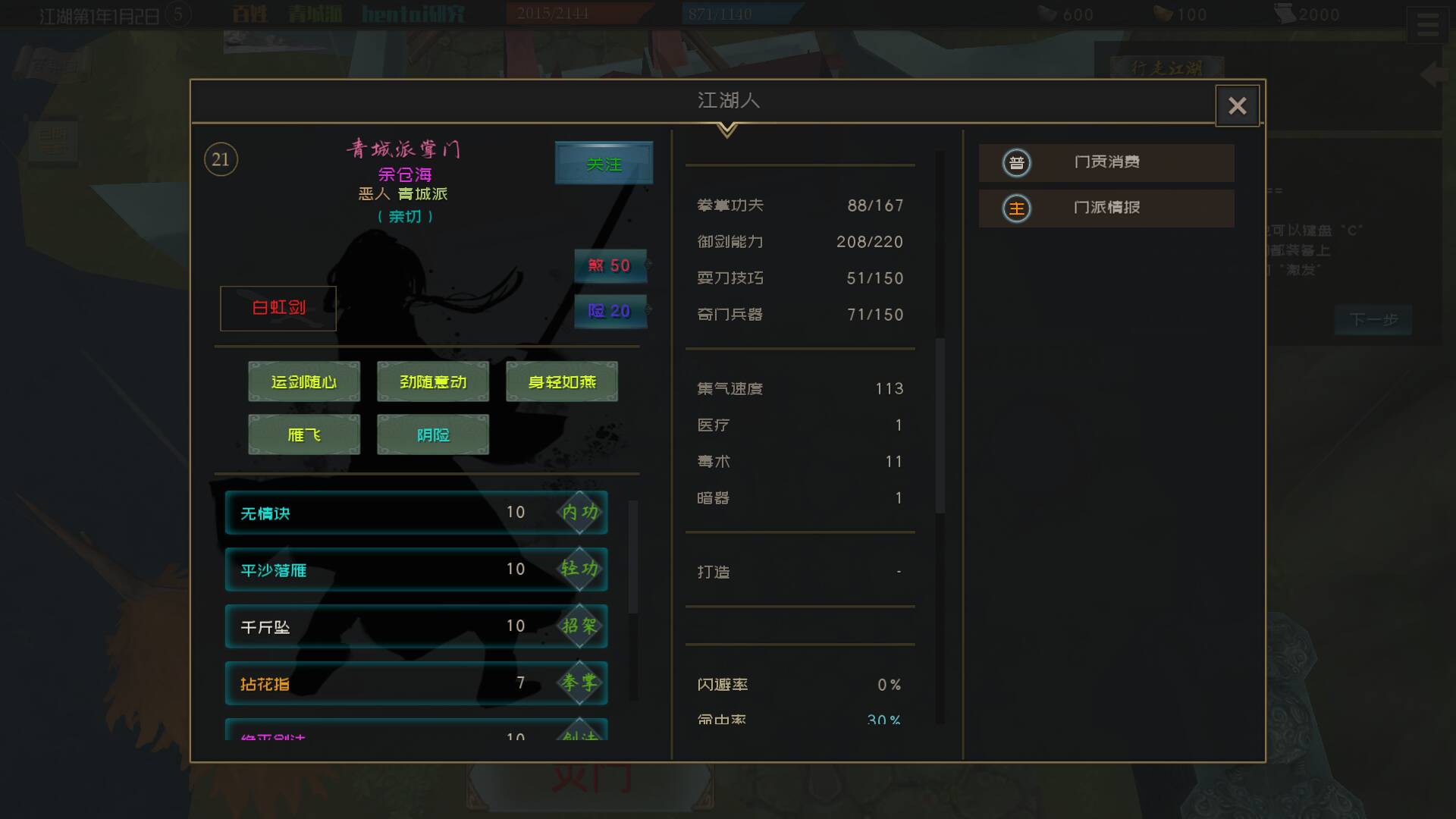 地图上除了人之外没有别的可以互动的事物,而我们点击不同人之后会显示对方的信息,你可以知道对方是干什么的,他的能力,武功,心法就跟扒底裤一样全部都显示在你的面前。唯独树立这个人最重要的个人简介是一个字没提。