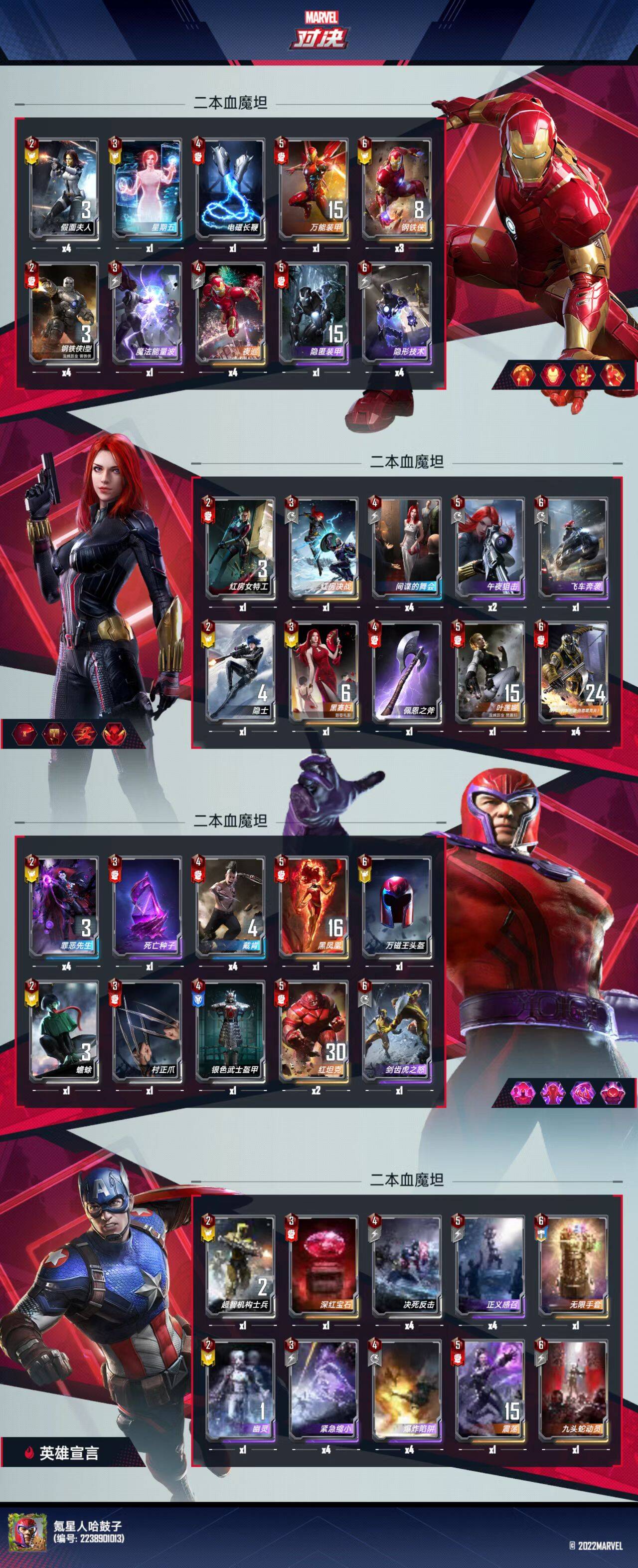 1、罪恶先生4张:卡2本的重要卡,三联四星一回合加两个红牌每个12功,比奥创复仇好用多了。