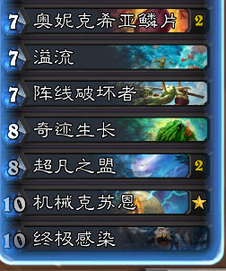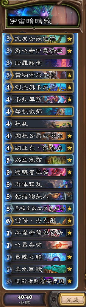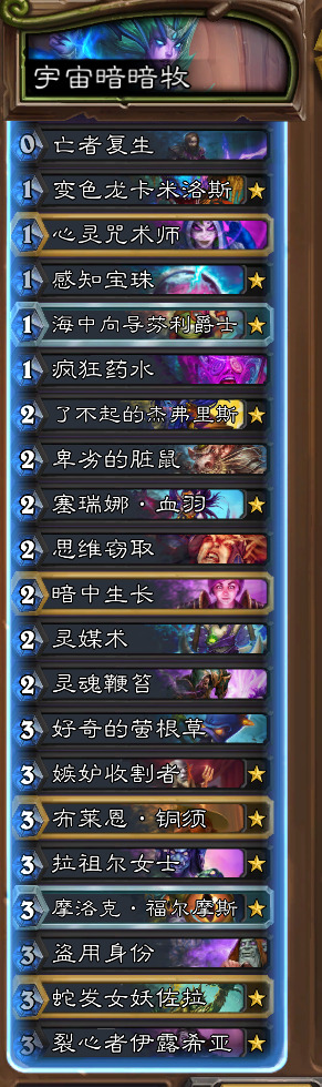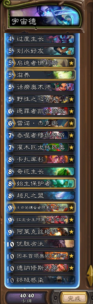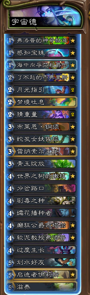 然后呢是宇宙德,玩德怎么可能不玩这个。我还是选择携带了超凡,卡扎只是添头罢了,毕竟为了打宇暗,多核心是很有必要的。硬要说最关键的还是古夫+超凡。超凡之后的展开实在太香,依靠三条红龙的强力节奏+爆发斩杀,超凡+滋养+粘液+过牌+鳞片+balabala,亦或者是超凡+滋养+粘液+剧毒之种+一地怪+优胜劣汰这种展开。不过有个问题是打牧师开超凡,因为被削弱的缘故可能会变成牧师的玩具。不要怕缺质量,这套牌细数一下一半以上都是质量,启迪者伊莉丝的存在能让你的质量直接爆炸。总之,玩起来非常爽(除了被快攻淦爆)。