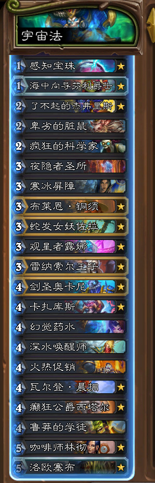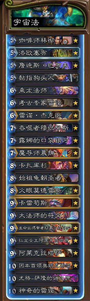 法师是抄了一套中外对抗赛的宇宙法,比较厚,玩起来也很爽。主要还是看口袋么,口袋之后芬利直接翻或者露娜右手第一张直接展开就是了。值得一提的是塞布非常关键,幻觉药水我一般留给塞布,铜须塞布+药水+若干大哥可以直接压死。火冲体系就一个学徒+晨拥,火眼触发之后伤害也是非常爆炸,口袋之后配合铜须+红龙可以打出非常逆天的斩杀。