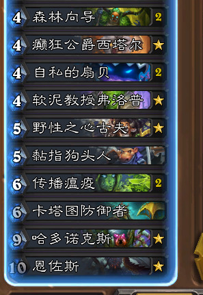 说到快攻德就提一嘴这个吃到环境红利的卡组,如同变装贼变德变法胜率高,变战变骑胜率低一样,快攻德在环境里可能会被默认为跳费德,起手会留诸如吃手手公爵这种牌应对明牌大帝(比如矿洞或者嘎嘎交鳞片解压力并不大的场面),快攻德buff相较于之前并不是那么优质,尤其是树木生长这张昨年非常强力的buff牌退环境,再加之没有咆哮的终结手段,现在的