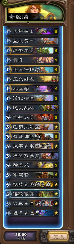 骑士呢只玩了一下奇数骑,毕竟当年奇数骑是很有感情的,第一个狂野传说也是奇数骑打上去的。现在战马训练师加强,奇数骑地位还是很尴尬,不过玩起来很爽就是了。玩了有个十来局吧,强度感觉一般般。
