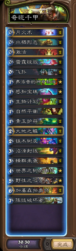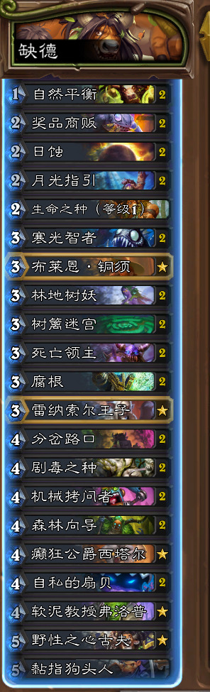 超凡削弱是毋庸置疑的,不能完成锁费绝杀任务牧,不能依靠超凡+滋养+???资源拉爆法师,但是,因为术士地标的削弱,版本初期最劣势的对局纯快攻小鬼术的落幕加上奇迹贼的崛起,牧师法师变多,环境的改变直接让跳费德因祸得福(雾)。因为古夫的存在,跳费德在中后期能给到非常大的操作空间,可以说是只输一手大帝被吃被换。因为环境里主流卡组是奇迹贼、任务牧、火冲法以及内战(卷),所以卡组应对方式不太一样。我的两套跳费德一套是B博士比赛用的携带娜迦巨人、森林之王、艾露恩神谕者的基础版跳费德,依靠节奏、展开获胜(卡组就不放了,一张没改),还有一套是去掉这些组件带上了堆肥+荆棘护卫+话痨奥术师的比较抗快攻的跳费德,B博士带了两张944可以酌情考虑去掉一张,为了打奇迹贼的时候保证能有944+**之鳞的配合就没有去掉。满编的海星在对阵快攻德的对局中非常关键。