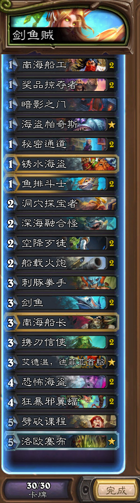 主要是玩了剑鱼贼,那叫一个简单粗暴。嫖贼和宇宙等着下个月低段位玩一玩(毕竟打宇暗有点......)。剑鱼贼这个抢血能力真的很离谱,对面的宇暗单雷诺被我摁死是常事,还有一个双雷诺的差十来血打死。40血的卡组,一个雷诺约等于以前两个雷诺,剑鱼贼抢血能力属实逆天,1费2-1(3-1战吼打1)巨型招个1-1加一个2-2,有时候招俩2-2,这种展开加上一把4-3的刀,怎么想都是逆天。从过牌、展开、直伤各种角度来看都是很完美的快攻。