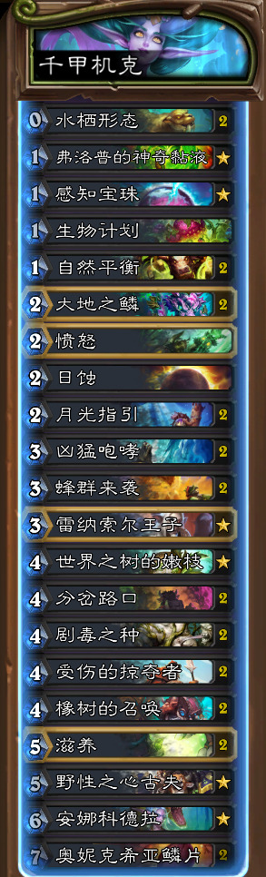 然后是千甲的进化版,王子机克千甲德。实操下来是舒服了很多,可惜超凡被削了,不然强度会更高一点。超凡之后粘液展开一回合可以完成非常多的操作,提前想好就直接启动,免得时间不够。因为有超凡的原因,粘液不一定留给千甲启动回合,水栖形态看见牌库底有诸如蜂群**之鳞之类的key牌可以先不拿,因为带了逆流+赖皮+奇迹生长,过牌大概率是会爆牌的,算好牌库数量把剩下的没用的牌爆掉(比如说第二个超凡)可以明显提升启动效率。