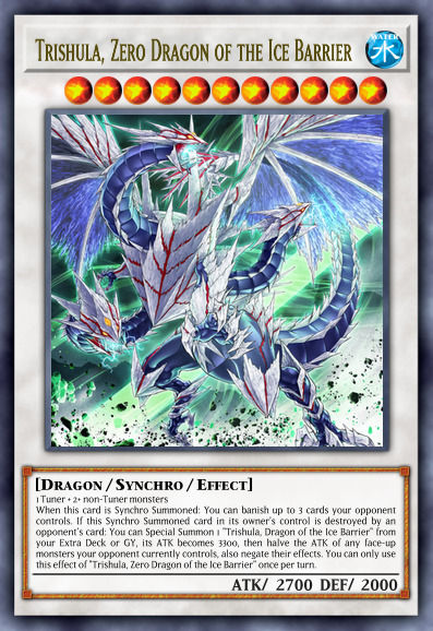 这个卡名的②的效果1回合只能使用1次。 ①:这张卡同调召唤成功时才能发动。选对方场上最多3张卡除外。 ②:同调召唤的这张卡被对方破坏的场合才能发动。从自己的额外卡组·墓地选1只「冰结界之龙 三叉龙」,攻击力变成3300特殊召唤。对方场上有表侧表示怪兽存在的场合,再让那些怪兽攻击力变成一半,效果无效化。