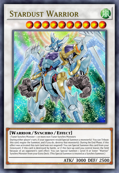 本次卡盒的炒鸡帅炒鸡强的封面怪兽——【星尘战士】,同时有【星尘】和【战士】双字段。被誉为龙战士版的星尘。①效果是牺牲者圣域的康怪兽特召版本,比星渣的效果更为实用。比星渣更强的是它还带个遗言效果,因战斗或者对手效果离场的时候可以从额外卡组把一只带【战士】字段的等级8或者以下的怪兽当做同步召唤特殊召唤,那选择可就多了去了,而且很多直接带很蠢,但是白拉出来就很顶的怪就可以带了,比如【硝基战士】、【涡轮战士】、【钻头战士】等等。星尘战士自己出场还简单,这下流星之路可就不止能出了【流星龙】了,而且先手出一个【星尘战士】对手也是很头疼的哦,因为此卡的①效果可以康的特召可是复数的,对方同时召唤多只怪兽,可是会被一次性全部康掉的哦。