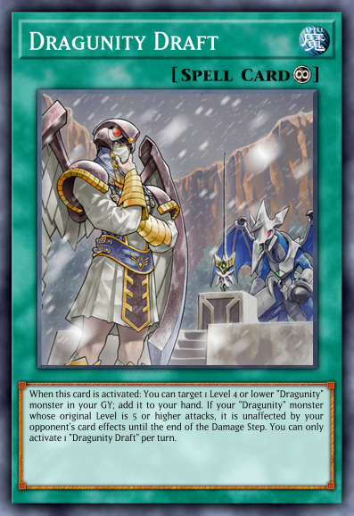 效果: 这个卡名的卡在1回合只能发动1张。 ①:这张卡的发动时,可以以自己墓地1只4星以下的「龙骑兵团」怪兽为对象。那个场合,那只怪兽加入手卡。 ②:这张卡在魔法与陷阱区域存在,原本等级是5星以上的自己的「龙骑兵团」怪兽攻击的场合,那只怪兽直到伤害步骤结束时不受对方的效果影响。