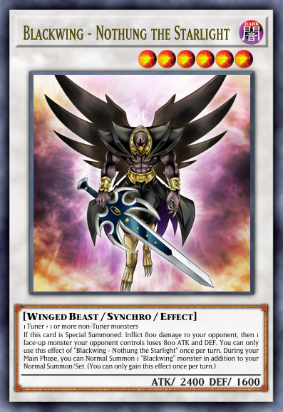 效果:自己场上表侧表示存在的名字带有「黑羽」的怪兽进行战斗的伤害步骤时可以把这张卡从手卡送去墓地,那只怪兽的攻击力直到这个回合的结束阶段时上升1400。
