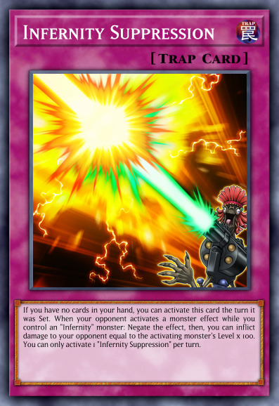 效果:这个卡名的卡在1回合只能发动1张。自己手卡是0张的场合,这张卡在盖放的回合也能发动。 ①:自己场上有「永火」怪兽存在,对方把怪兽的效果发动时才能发动。那个效果无效。那之后,可以给与对方那只怪兽的等级×100伤害。