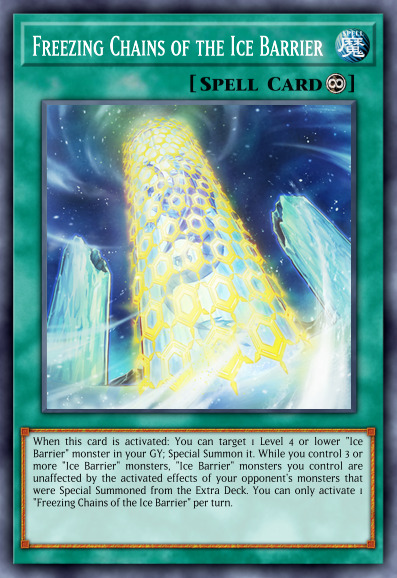 效果:这个卡名的卡在1回合只能发动1张。 ①:这张卡的发动时,可以以自己墓地1只4星以下的「冰结界」怪兽为对象。那个场合,那只怪兽特殊召唤。 ②:只要这张卡在魔法与陷阱区域存在并在自己场上有「冰结界」怪兽3只以上存在,自己场上的「冰结界」怪兽不受从额外卡组特殊召唤的对方怪兽发动的效果影响。