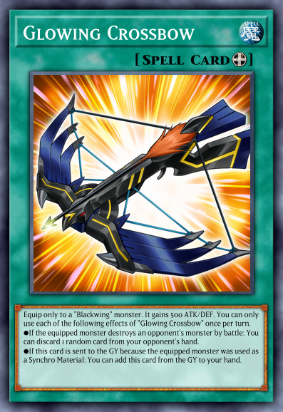 效果:「黑羽」怪兽才能装备。这个卡名的②③的效果1回合各能使用1次。①:装备怪兽的攻击力·守备力上升500。②:装备怪兽战斗破坏对方怪兽的场合才能发动。对方手卡随机选1张丢弃。③:装备怪兽成为同调素材让这张卡被送去墓地的场合才能发动。墓地的这张卡加入手卡。