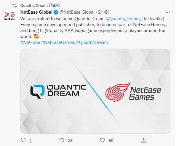 今天(8月31日)下午,网易NetEase Global 官方推特发布置顶消息,网易收购《底特律 成为人类》开发商Quantic Dream,Quantic Dream的官方推特转发了该推特动态。