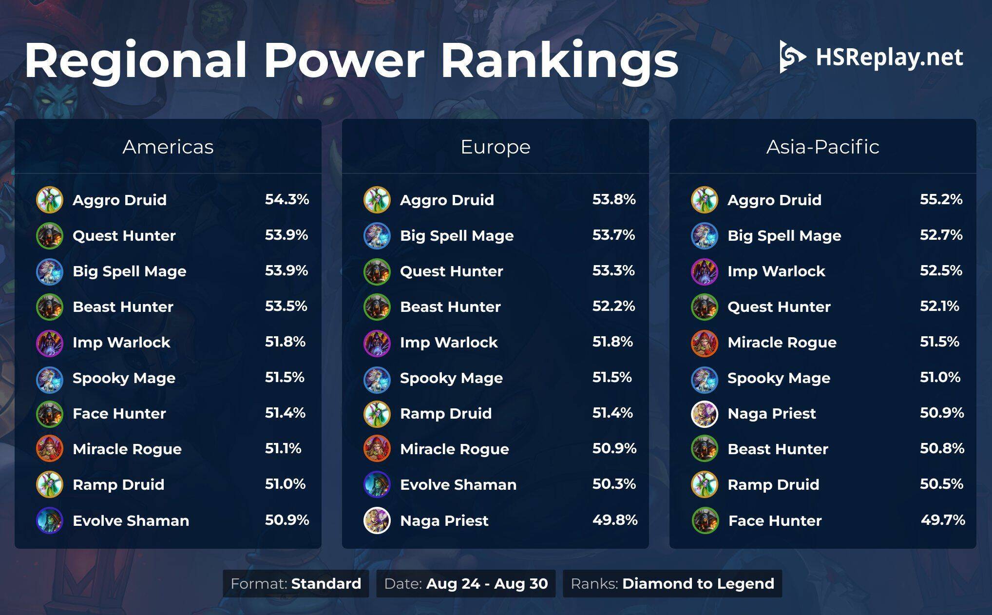 HSReplay总结了8月24日8月30日钻石到传说分段三个服务器胜率较高的卡组,补丁的消息也快来了,等一手大规模削弱改善环境。