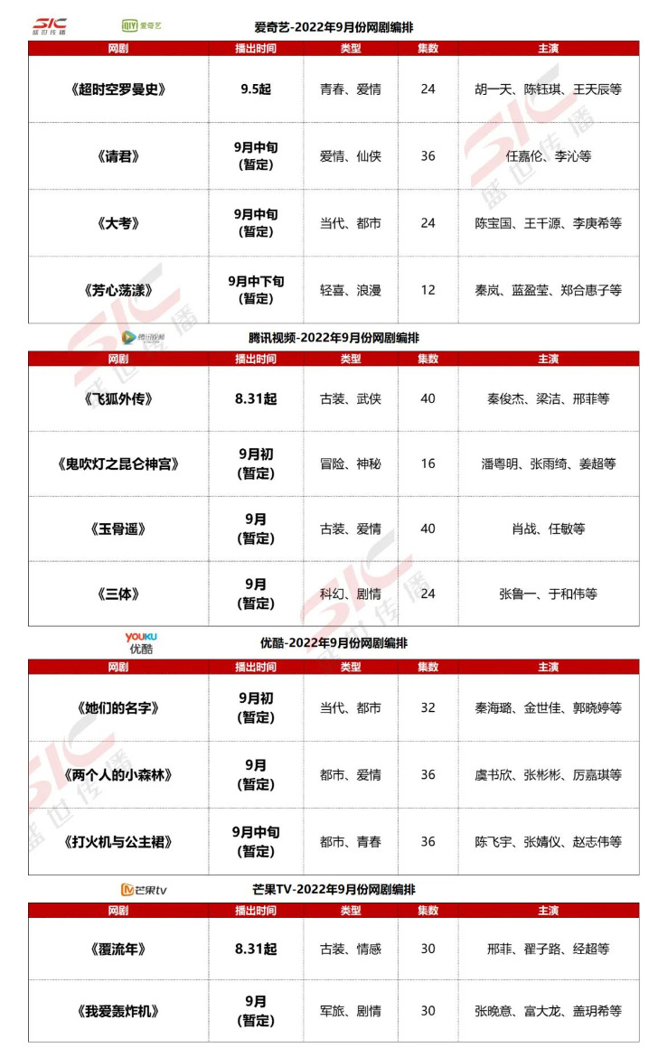 据盛世传播集团公布的爱奇艺腾讯优酷芒果9月排播表,《三体》暂定于9月播出,上线腾讯视频。