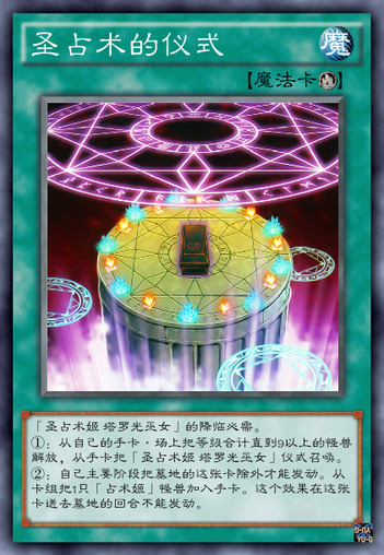 此卡的原作效果为①:从自己的手牌或场上,将等级合计9以上的怪兽解放,从手牌仪式召唤「圣占术姬 塔罗蕾」。实卡加强,给予了检索本家怪兽的二效。