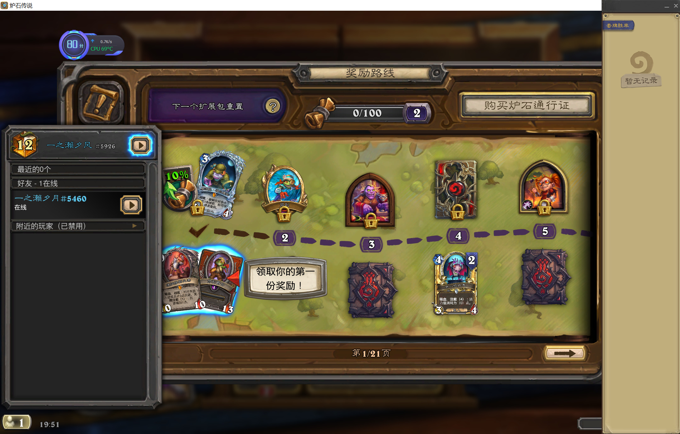 前一段时间,做了任务和打天梯之后,奖励路线的金币和随机传说等都没有领取,今天再打开炉石就发现奖励都领不了了,重置成2级0/100了