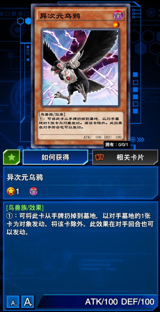 在考虑再三之后,我决定在介绍T表卡组之前先介绍这张在目前环境里非常吃香的泛用手坑:DD乌鸦。这是一张在DL中非常罕见的自由时点发效的手坑,可以除外对方墓地的一张卡。看似不起眼的效果却几乎会对DL环境中的所有主流卡组造成巨大甚至是毁灭性的打击。因为目前的主流卡组蔷薇龙,机皇,银河眼,英雄等等都或多或少需要墓地作为资源来启动,而一旦被打断则几乎难以妥协。