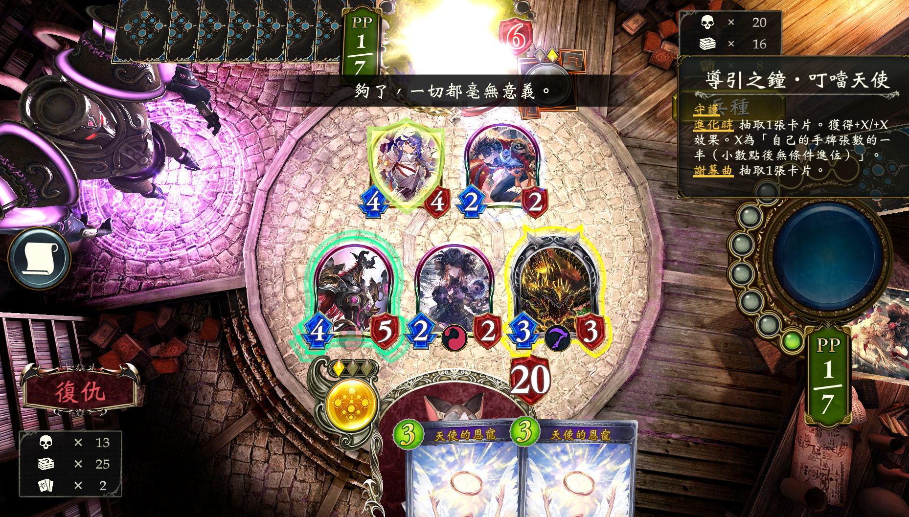 【第3回合】优先触发巨蝎、迦梨或灵魔的自动进化效果。为了触发迦梨效果或急需过牌的话,可以使用奋战;没有迦梨需要配合而且手牌尚可的话,优先保留奋战。先手无事可做的话,可以使用天使的恩宠。不要使用夕月,除非后手预计对手无法解场。其他参考第2回合动作。