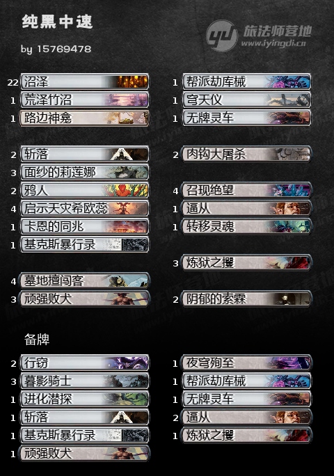 这套牌之所以能够成为一套出色的中速套牌是因为他有着优秀的2345费连拍曲线,二费败犬或者鸦人,三费娜娜,墓地擅闯者。四费索林,黑魔判,五费招现绝望,传记。并且有着大量的去除来应付各种场景,备牌也会使用点弃来应对对方的威胁。