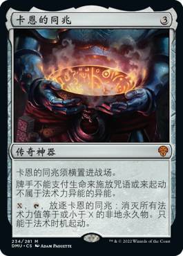 卡恩的同兆,我喜欢称呼他为大锅,这是我这套纯黑中速比起别人套牌最特殊的一张牌。首先他的第一个异能可以封印败犬的急袭,以及一些可能不太常见的付血异能。这里需要着重提一下他的第二个效果。在T2环境中,任何套牌都绕不过一个问题就是面对对方沾红套牌的奇奇时应该如何应对,无论如何对方的奇奇都是一张1换2的牌,而且拥有滤抽能力和终结能力,让人十分头痛。同样的白色的成婚结界虽然没有奇奇来的那么快,但也同样让人十分头痛。