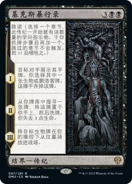 最后比较重要的单卡是这张多明的新传记,三个异能都简单粗暴,跳读也让他拥有了灵活性,我经常跳读2异能来检索需要的单卡,或者3异能直接拉起坟场的黑魔判或者对方的泰坦等巨大威胁来终结比赛。