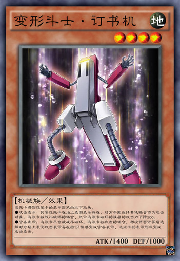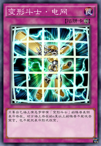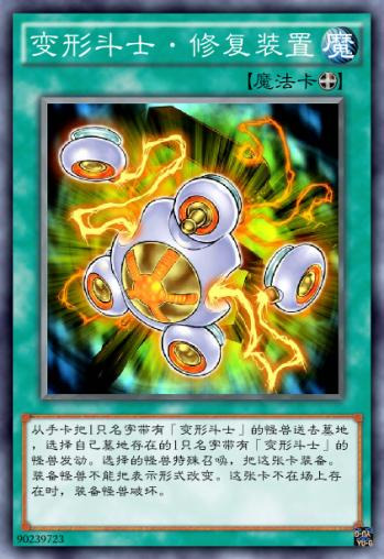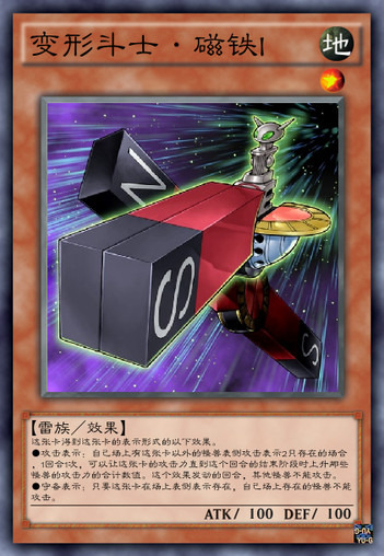 在自己的回合中获得攻击力强化和怪兽效果无效化的效果。具有攻击性的效果,非常适合进攻。攻击力上升1000点,所以大部分怪物都可以战斗破坏。《变形斗士·磁铁U》或者防守表示的《变形斗士·滑板》留场的话,用此卡装备在其他怪兽上可以干扰对方。